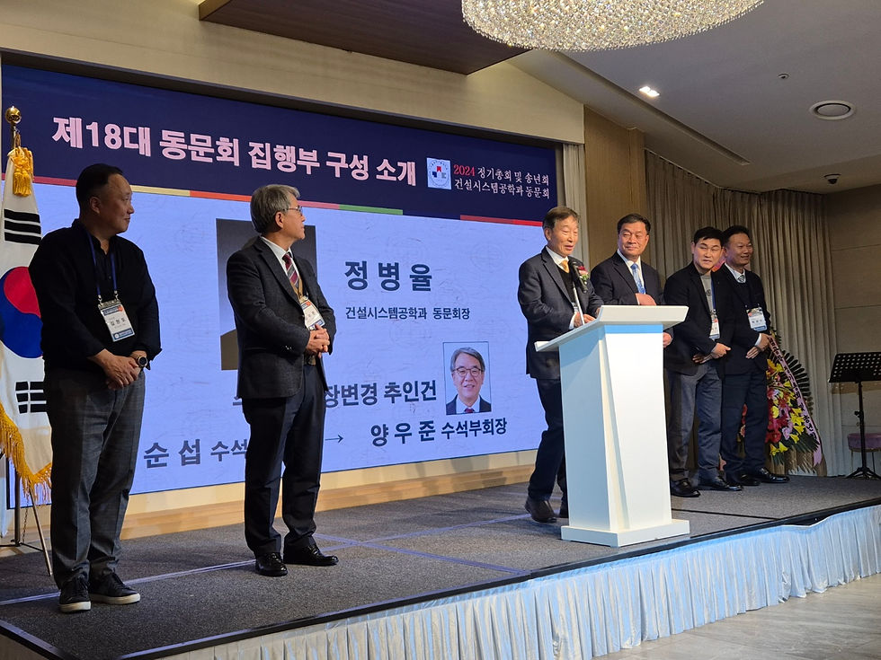2024년 11월 27일 수요일, 서울과학기술대학교 건설시스템공학과 동문회 정기총회 및 송년회가 르비르모어에서 성황리에 개최되었습니다.총동문회 박경종 회장은 건설시스템공학과 동문회 송년회에 참석하여, 동문 간의 유대 강화를 위한 격려와 지속적인 발전을 위한 인사말을 전하며 협찬을 아끼지 않았습니다.앞으로도 건설시스템공학과 정병율 회장님을 비롯한 동문회가 더욱 발전하여 총동문회의 유대 강화를 이끌어 나가기를 기원합니다.